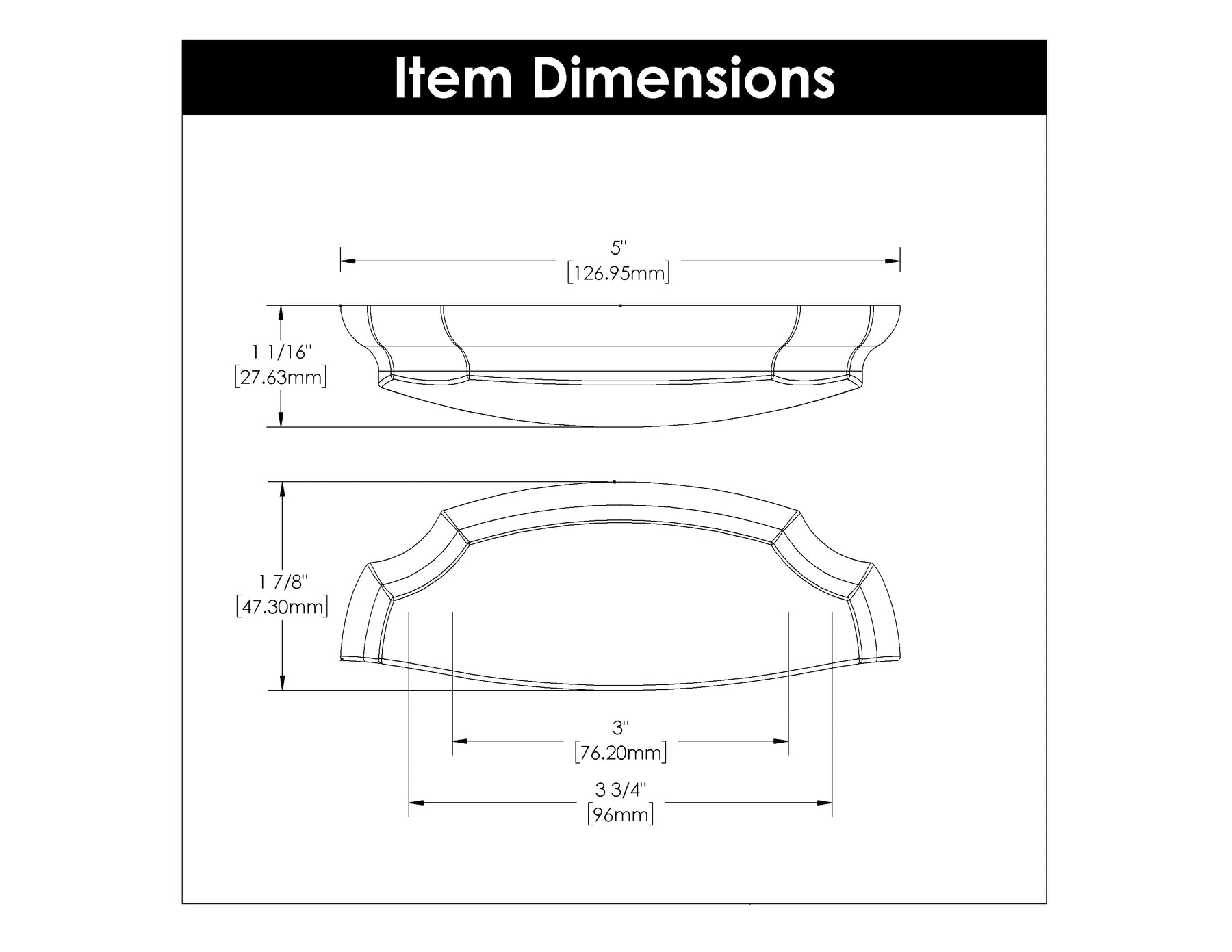 Dimensions: Center to Center: 3 Inch & 3-3/4 Inch (96mm), Length: 5 Inch, Width: 1-7/8 Inch, Projection: 1-1/16 Inch