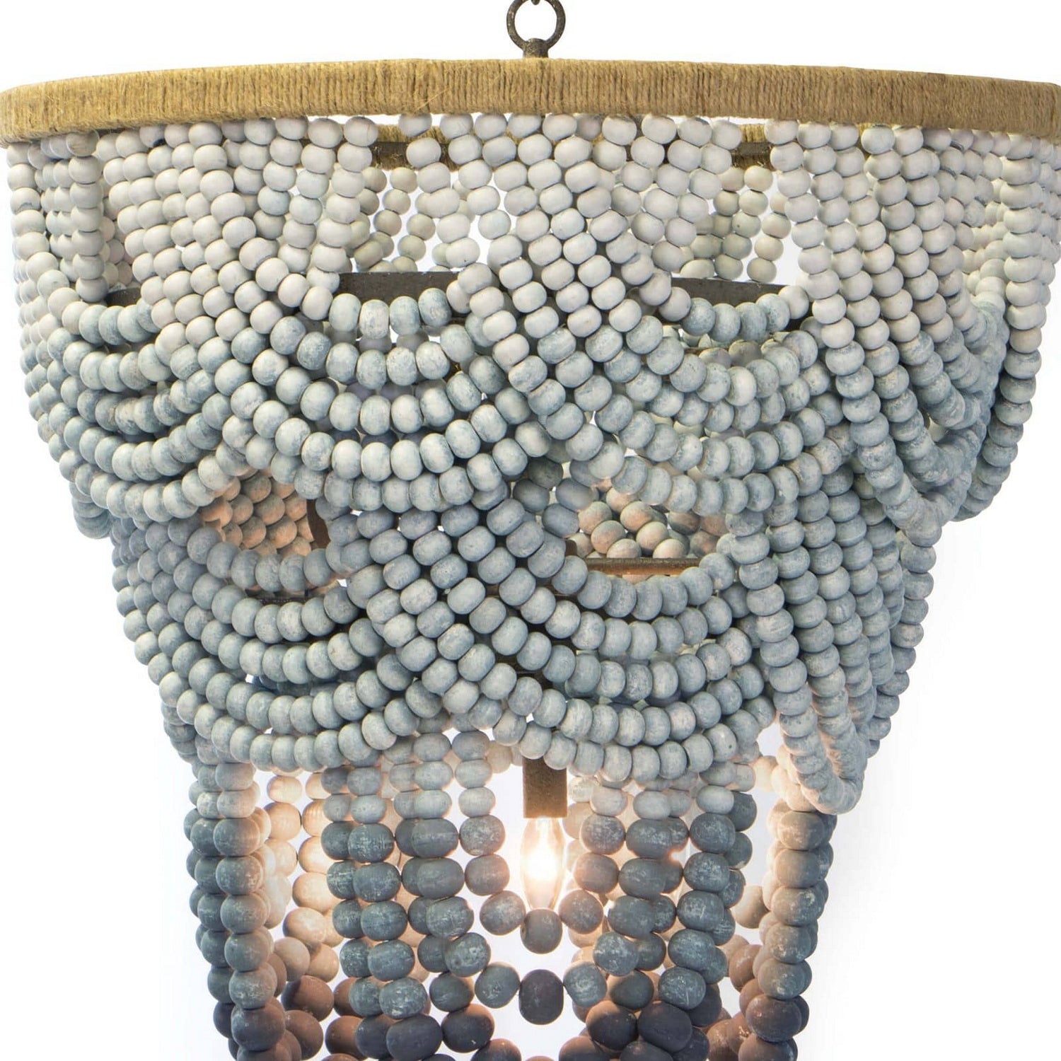 Ombre breaks into lighting in this latest coastal chic wood-beaded chandelier. Wooden beads in various shades of blue drape gracefully in gradient layers from a jute-wrapped circular frame. This would look serene in a living room or breakfast nook.